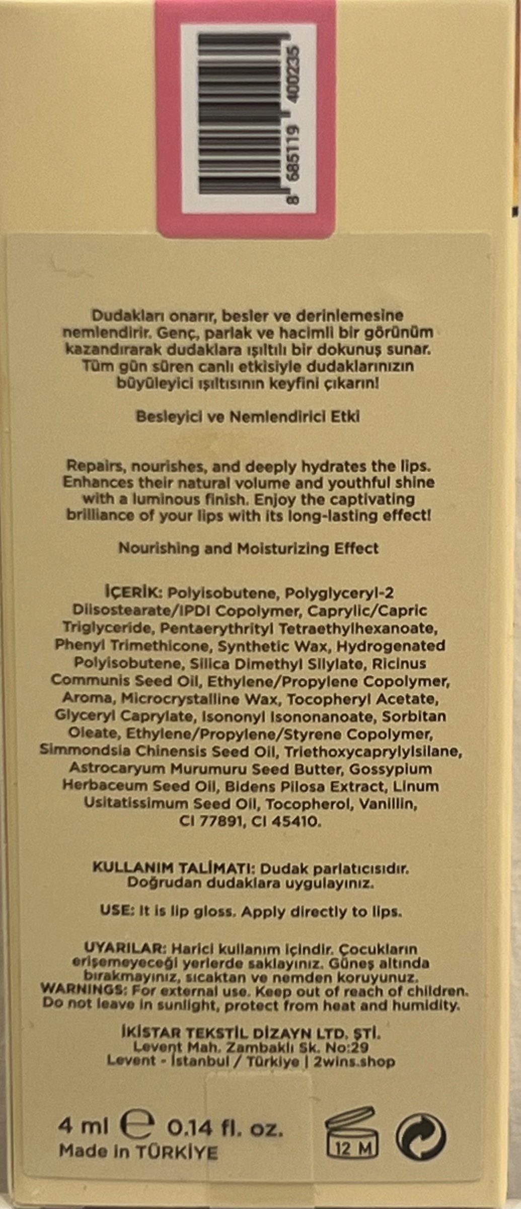 Polyisobutene, Polyglyceryl-2 Diisostearate/IPDI Copolymer, Caprylic/Capric Triglyceride, Pentaerythrityl Tetraethylhexanoate, Phenyl Trimethicone, Synthetic Wax, Hydrogenated Polyisobutene, Silica Dimethyl Silylate, Ricinus Communis Seed Oil, Ethylene/Propylene Copolymer, Aroma, Microcrystalline Wax, Tocopheryl Acetate, Glyceryl Caprylate, Isononyl Isononanoate, Sorbitan Oleate, Ethylene/Propylene/Styrene Copolymer, Simmondsia Chinensis Seed Oil, Triethoxycaprylylsilane, Astrocaryum Murumuru Seed Butter, Gossypium Herbaceum Seed Oil, Bidens Pilosa Extract, Linum Usitatissimum Seed Oil, Tocopherol, Vanillin, CI 77891, CI 45410.