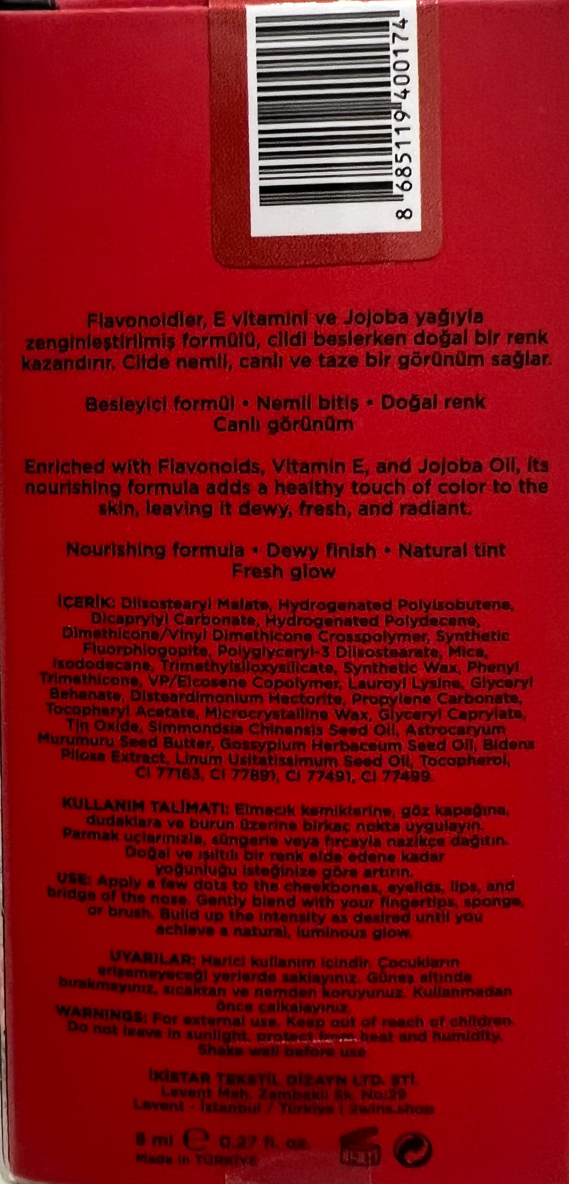 Diisostearyl Malate, Hydrogenated Polyisobutene, Dicaprylyl Carbonate, Hydrogenated Polydecene, Dimethicone/Vinyl Dimethicone Crosspolymer, Synthetic Fluorphlogopite, Polyglyceryl-3 Diisostearate, Mica, Isododecane, Trimethylsiloxysilicate, Synthetic Wax, Phenyl Trimethicone, VP/Eicosene Copolymer, Lauroyl Lysine, Glyceryl Behenate, Disteardimonium Hectorite, Propylene Carbonate, Tocopheryl Acetate, Microcrystalline Wax, Glyceryl Caprylate, Tin Oxide, Simmondsia Chinensis Seed Oil, Astrocaryum Murumuru Seed Butter, Gossypium Herbaceum Seed Oil, Bidens Pilosa Extract, Linum Usitatissimum Seed Oil, Tocopherol, CI 77163, CI 77891, CI 77491, CI 77499.