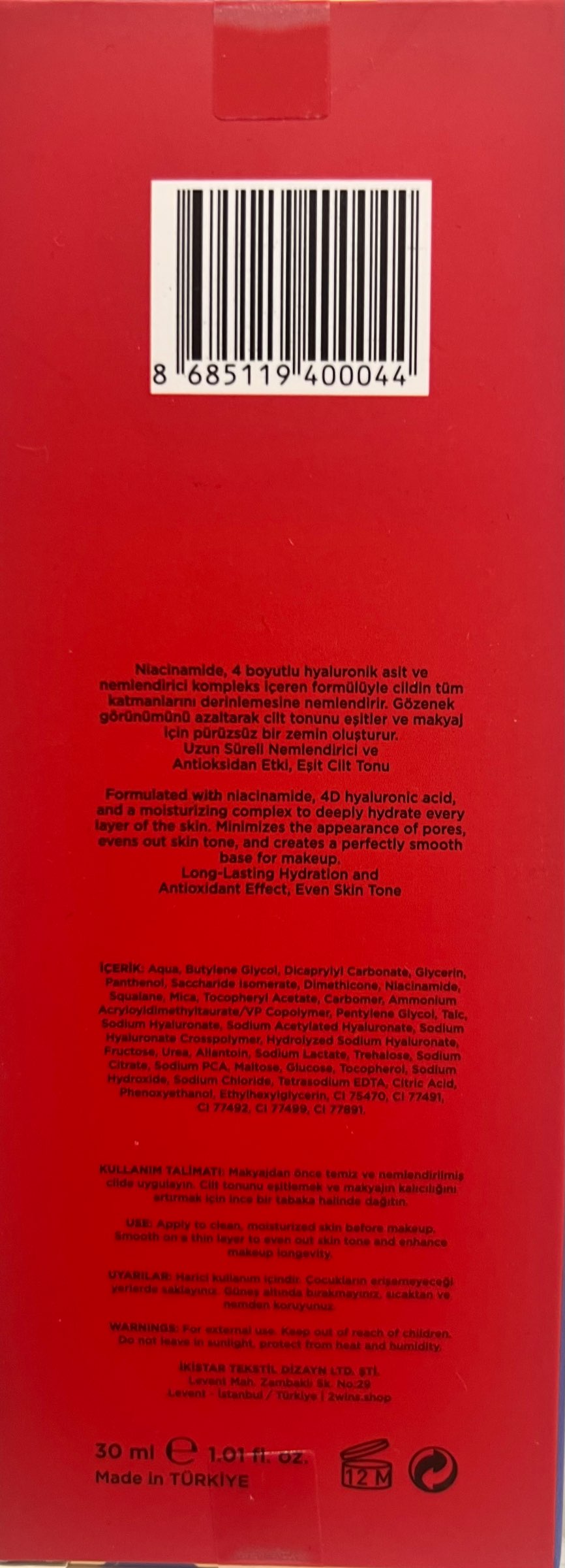 Aqua, Butylene Glycol, Dicaprylyl Carbonate, Glycerin, Panthenol, Saccharide Isomerate, Dimethicone, Niacinamide, Squalane, Mica, Tocopheryl Acetate, Carbomer, Ammonium Acryloyldimethyltaurate/VP Copolymer, Pentylene Glycol, Talc, Sodium Hyaluronate, Sodium Acetylated Hyaluronate, Sodium Hyaluronate Crosspolymer, Hydrolyzed Sodium Hyaluronate, Fructose, Urea, Allantoin, Sodium Lactate, Trehalose, Sodium Citrate, Sodium PCA, Maltose, Glucose, Tocopherol, Sodium Hydroxide, Sodium Chloride, Tetrasodium EDTA, Citric Acid, Phenoxyethanol, Ethylhexylglycerin, CI 75470, CI 77491, CI 77492, CI 77499, CI 77891.