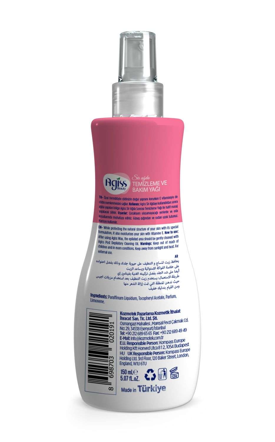 Agiss Ağda Temizleme ve Masaj Yağı ağda sonrasında ciltte kalan ağda kalıntılarının temizlenmesi amacıyla kullanılır. Aynı zamanda cilde nemlilik kazandırır. Hoş kokusu ile cildinizi şımartır.