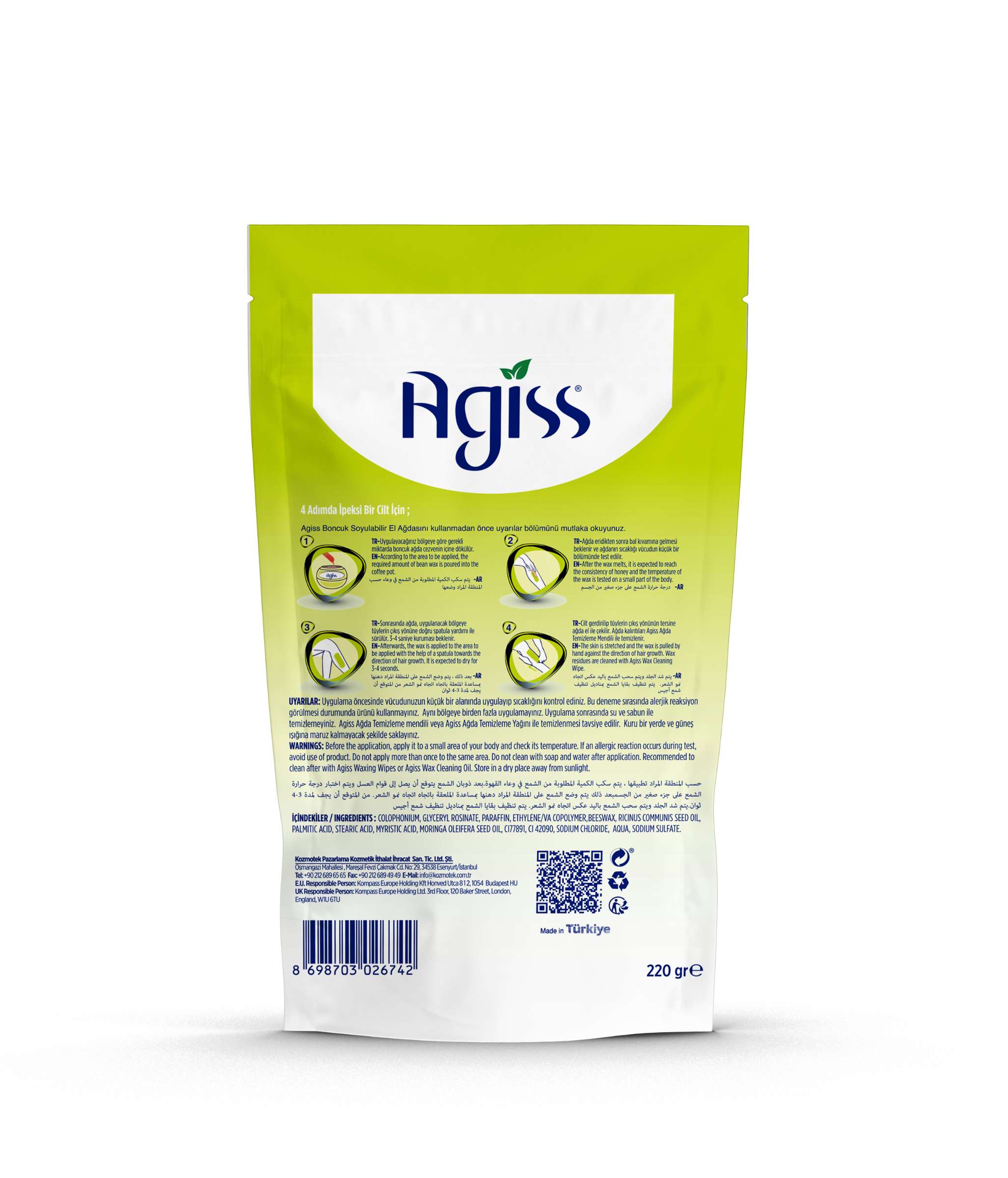 Uygulama öncesinde vücudunuzun küçük bir alanında uygulayıp sıcaklığını kontrol ediniz. Bu deneme sırasında alerjik reaksiyon görülmesi durumunda ürünü kullanmayınız. Aynı bölgeye birden fazla uygulamayınız. Uygulama sonrasında su ve sabun ile temizlemeyiniz. Agiss Ağda Temizleme mendili veya Agiss Ağda Temizleme Yağını ile temizlenmesi tavsiye edilir. Kuru bir yerde ve güneş ışığına maruz kalmayacak şekilde saklayınız.