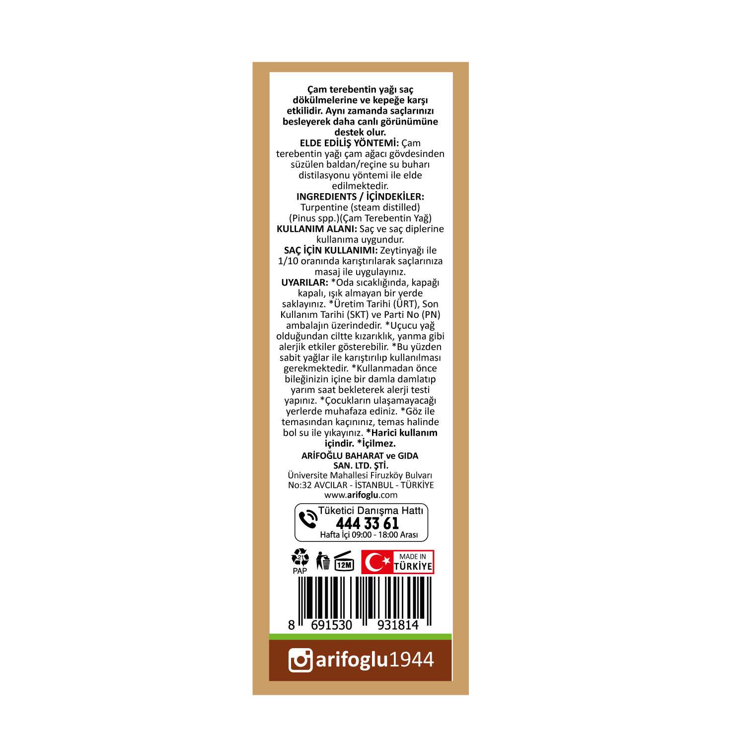 Arifoğlu Çam Terebentin Yağı 50 ml İçindekiler