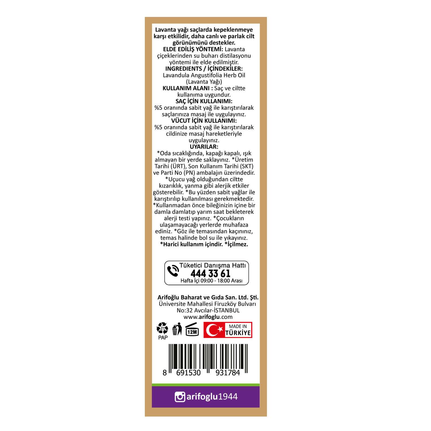 Lavanta yağı saçlarda kepeklenmeye karşı etkilidir, daha canlı ve parlak cilt görünümünü destekler.ELDE EDİLİŞ YÖNTEMİ: Lavanta çiçeklerinden su buharı distilasyonu yöntemi ile elde edilmiştir.INGREDIENTS / İÇİNDEKİLER: Lavandula Angustifolia Herb Oil (Lavanta Yağı) KULLANIM ALANI : Saç ve ciltte kullanıma uygundur.SAÇ İÇİN KULLANIMI:%5 oranında sabit yağ ile karıştırılarak saçlarınıza masaj ile uygulayınız.VÜCUT İÇİN KULLANIMI: %5 oranında sabit yağ ile karıştırılarak cildinize masaj hareketleriyle uygulayınız.UYARILAR: *Oda sıcaklığında, kapağı kapalı, ışık almayan bir yerde saklayınız. *Üretim Tarihi (ÜRT), Son Kullanım Tarihi (SKT) ve Parti No (PN) ambalajın üzerindedir. *Uçucu yağ olduğundan ciltte kızarıklık, yanma gibi alerjik etkiler gösterebilir. *Bu yüzden sabit yağlar ile karıştırılıp kullanılması gerekmektedir. *Kullanmadan önce bileğinizin içine bir damla damlatıp yarım saat bekleterek alerji testi yapınız. *Çocukların ulaşamayacağı yerlerde muhafaza ediniz. *Göz ile temasından kaçınınız, temas halinde bol su ile yıkayınız. *Harici kullanım içindir. *İçilmez. ARİFOĞLU BAHARAT ve GIDA SAN. LTD. ŞTİ.