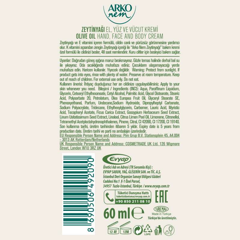 Arko Nem Değerli Yağlar Zeytinyağlı El ve Vücut Kremi 60 ml ile bakımlı ve ışıldayan bir cilde sahip olabilirsiniz. Zeytinyağlı el ve vücut kremi kuru cilt tipine sahip kişiler için özel olarak geliştirilir. Bu kremin içerisinde yer alan bileşenler nem ihtiyacı duyan cilt yüzeyinin nem ihtiyacını anında giderir. Cildi canlandırır ve yumuşacık yapar.
