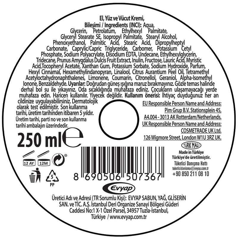 Aqua, Glycerin, Paraffinum Liquidum, Petrolatum, Glyceryl Stearate SE, Stearyl Alcohol, Palmitic Acid, Phenoxyethanol, Stearic Acid, Sodium Hydroxide, Parfum, Carbomer, Potassium Cetyl Phosphate, Sodium Polyacrylate, Disodium EDTA, Myristic Acid, Lauric Acid, Inulin, Tocopheryl Acetate, Prunus Amygdalus Dulcis Fruit Extract, Fructose, Xanthan Gum, Potassium Sorbate, Hexyl Cinnamal, Hexamethylindanopyran, Linalool, Citrus Aurantium Peel Oil, Tetramethyl Acetyloctahydronaphthalenes, Limonene, Coumarin, Citronellol, Geraniol, Alpha-Isomethyl Ionone, Benzaldehyde.