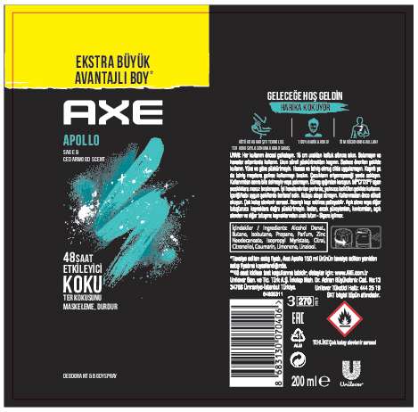 Axe etkisi ile çekiciliğini ikiye katlamak ister misin? Karşı konulmaz kokusuyla ter kokusuna karşı mücadelende yanında olan yeni Axe Apollo EKSTRA BÜYÜK AVANTAJLI BOY Deodorant & Bodyspray ter kokusunu maskelemez, durdurur. 48 saat boyunca kalıcılığını koruyan harika kokusuyla bu sprey deodorant, gün boyu ferah hissetmeni sağlar. Axe’ın etkileyici kokusu üzerindeyken karşı konulmaz hissetmen kaçınılmaz! Üstelik şimdi tam sana göre 200ml boyuyla Axe Apollo EKSTRA BÜYÜK AVANTAJLI BOY ekstra büyük, ekstra çekici!