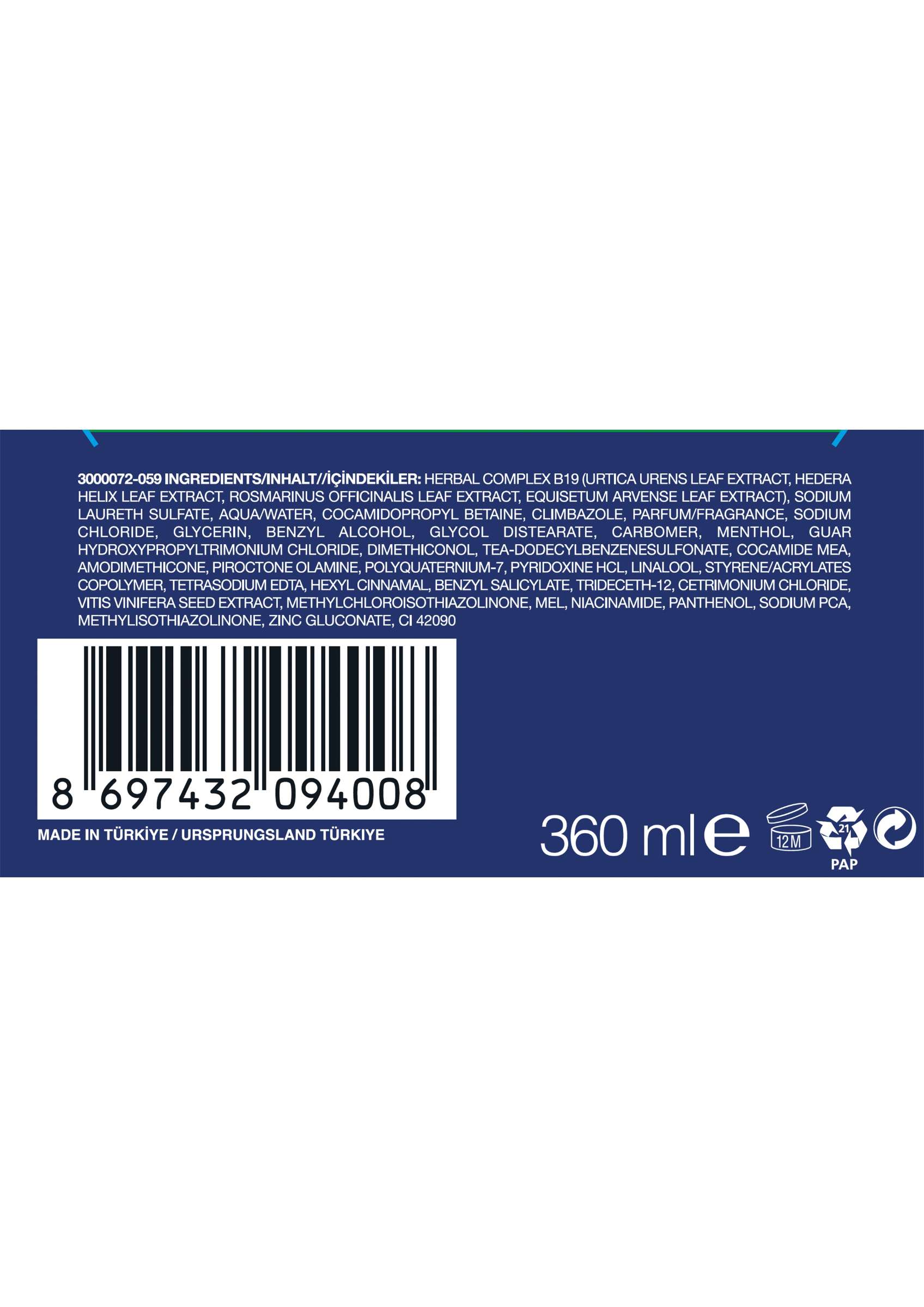 Herbal Complex B19 (Urtica Urens Leaf Extract, Hedera Helix Leaf Extract, Rosmarinus Officinalis Leaf Extract, Equisetum Arvense Leaf Extract), Sodium Laureth Sulfate, Aqua (Water), Cocamidopropyl Betaine, Climbazole, Parfum (Fragrance), Sodium Chloride, Glycerin, Benzyl Alcohol, Glycol Distearate, Carbomer, Menthol, Guar Hydroxypropyltrimonium Chloride, Dimethiconol, TEA-Dodecylbenzenesulfonate, Cocamide MEA, Amodimethicone, Piroctone Olamine, Polyquaternium-7, Pyridoxine HCl, Linalool, Styrene/Acrylates Copolymer, Tetrasodium EDTA, Hexyl Cinnamal, Benzyl Salicylate, Trideceth-12, Cetrimonium Chloride, Vitis Vinifera (Grape) Seed Extract, Methylchloroisothiazolinone, Mel, Niacinamide, Panthenol, Sodium PCA, Methylisothiazolinone, Zinc Gluconate, CI 42090.