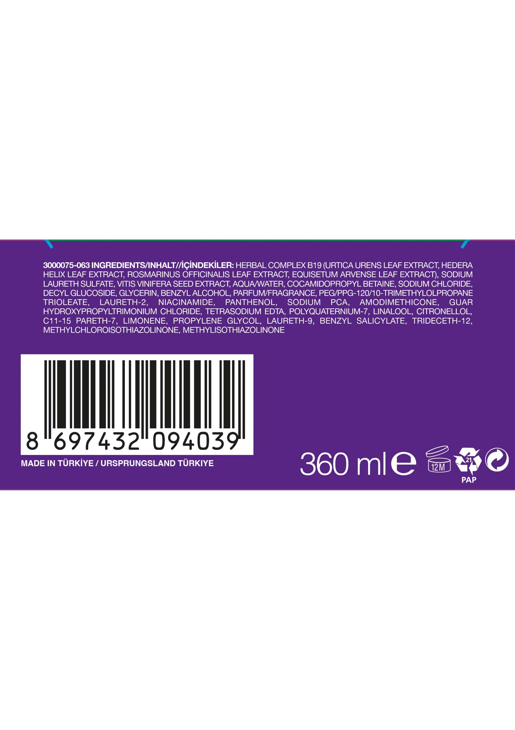 Herbal Complex B19 (Urtica Urens Leaf Extract, Hedera Helix Leaf Extract, Rosmarinus Officinalis Leaf Extract, Equisetum Arvense Leaf Extract), Sodium Laureth Sulfate, Vitis Vinifera Seed Extract, Aqua / Water, Cocamidopropyl Betaine, Sodium Chloride, Decyl Glucoside, Glycerin, Benzyl Alcohol, Parfum / Fragrance, PEG / PPG-120 / 10 Trimethylolpropane Trioleate, Laureth-2, Niacinamide, Panthenol, Sodium PCA, Amodimethicone, Guar Hydroxypropyltrimonium Chloride, Tetrasodium EDTA, Polyquaternium-7, Linalool, Citronellol, C11-15 Pareth-7, Limonene, Propylene Glycol, Laureth-9, Benzyl Salicylate, Trideceth-12, Methylchloroisothiazolinone, Methylisothiazolinone.