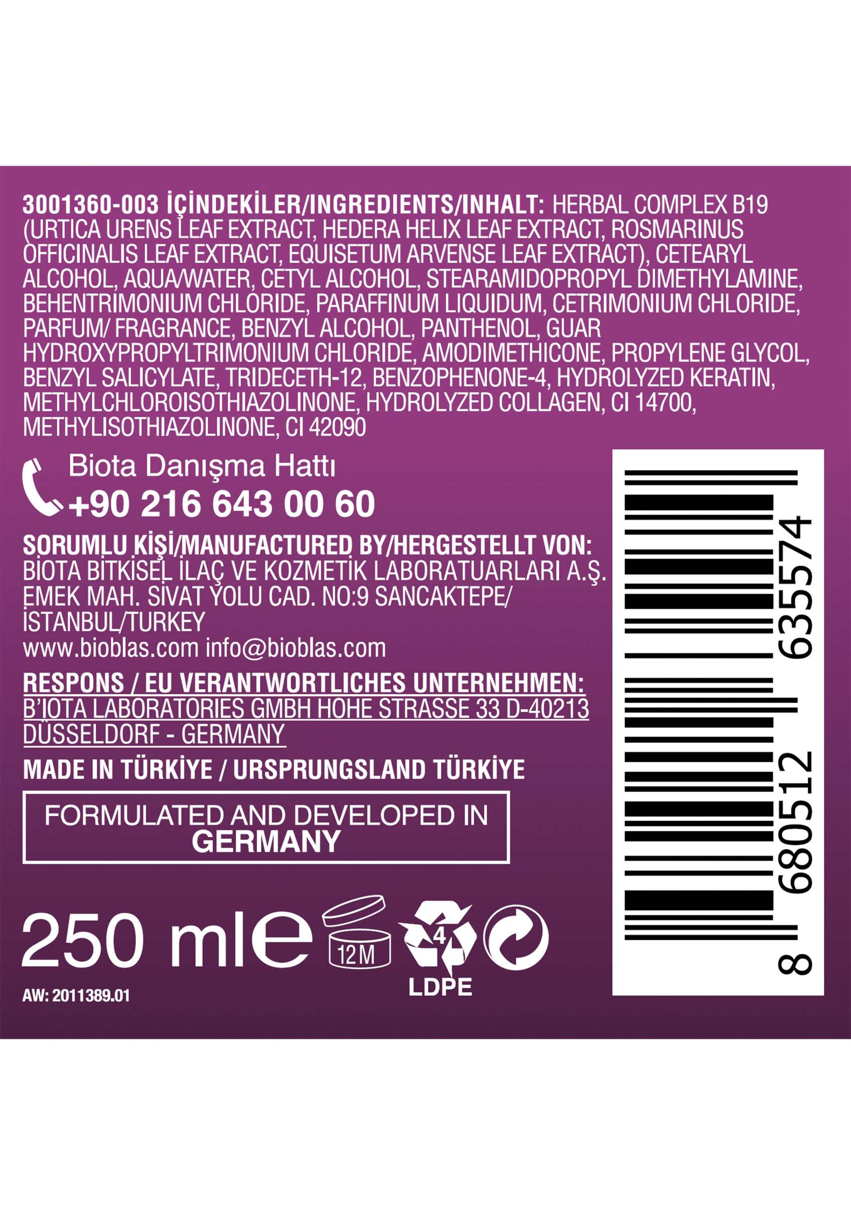 Herbal Complex B19 (Urtica Urens Leaf Extract, Hedera Helix Leaf Extract, Rosmarinus Officinalis Leaf Extract, Equisetum Arvense Leaf Extract), Cetearyl Alcohol, Aqua / Water, Cetyl Alcohol, Stearamidopropyl Dimethylamine, Behentrimonium Chloride, Paraffinum Liquidum, Cetrimonium Chloride, Parfum / Fragrance, Benzyl Alcohol, Panthenol, Guar Hydroxypropyltrimonium Chloride, Amodimethicone, Propylene Glycol, Benzyl Salicylate, Trideceth-12, Benzophenone-4, Hydrolyzed Keratin, Methylchloroisothiazolinone, Hydrolyzed Collagen, CI 14700, Methylisothiazolinone, CI 42090