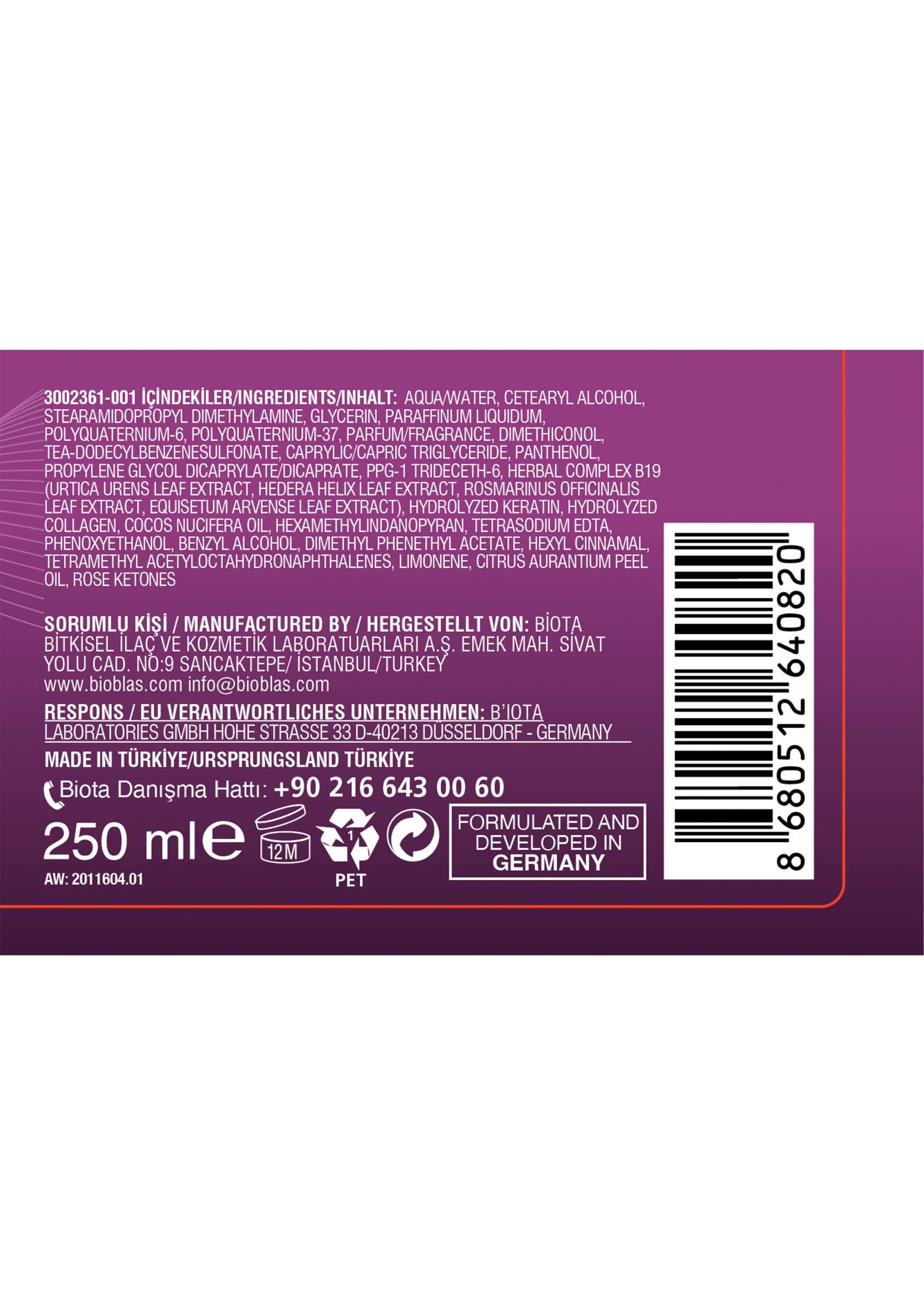 Aqua / Water, Cetearyl Alcohol, Stearamidopropyl Dimethylamine, Glycerin, Paraffinum Liquidum, Polyquaternium-6, Polyquaternium-37, Parfum / Fragrance, Dimethiconol, TEA-Dodecylbenzenesulfonate, Caprylic / Capric Triglyceride, Panthenol, Propylene Glycol Dicaprylate / Dicaprate, PPG-1 Trideceth-6, Herbal Complex B19 (Urtica Urens Leaf Extract, Hedera Helix Leaf Extract, Rosmarinus Officinalis Leaf Extract, Equisetum Arvense Leaf Extract), Hydrolyzed Keratin, Hydrolyzed Collagen, Cocos Nucifera Oil, Hexamethylindanopyran, Tetrasodium EDTA, Phenoxyethanol, Benzyl Alcohol, Dimethyl Phenethyl Acetate, Hexyl Cinnamal, Tetramethyl Acetyloctahydronaphthalenes, Limonene, Citrus Aurantium Peel Oil, Rose Ketones.