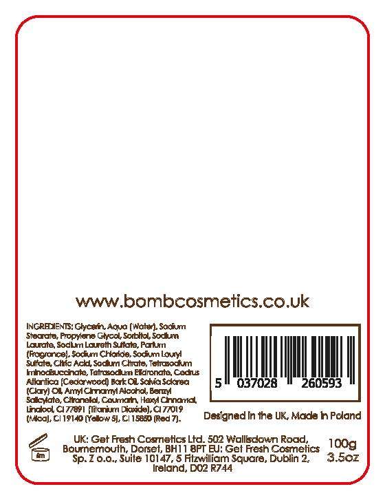INGREDIENTS: Glycerin, Aqua (Water), Sodium Stearate, Propylene Glycol, Sorbitol, Sodium Laurate, Sodium Laureth Sulfate, Parfum (Fragrance), Sodium Chloride, Sodium Lauryl Sulfate, Citric Acid, Sodium Citrate, Tetrasodium Iminodisuccinate, Tetrasodium Etidronate, Cedrus Atlantica (Cedarwood) Bark Oil, Salvia Sclarea (Clary) Oil, Amyl Cinnamyl Alcohol, Benzyl Salicylate, Citronellol, Coumarin, Hexyl Cinnamal, Linalool, CI 77891 (Titanium Dioxide), CI 77019 (Mica), CI 19140 (Yellow 5), CI 15850 (Red 7).