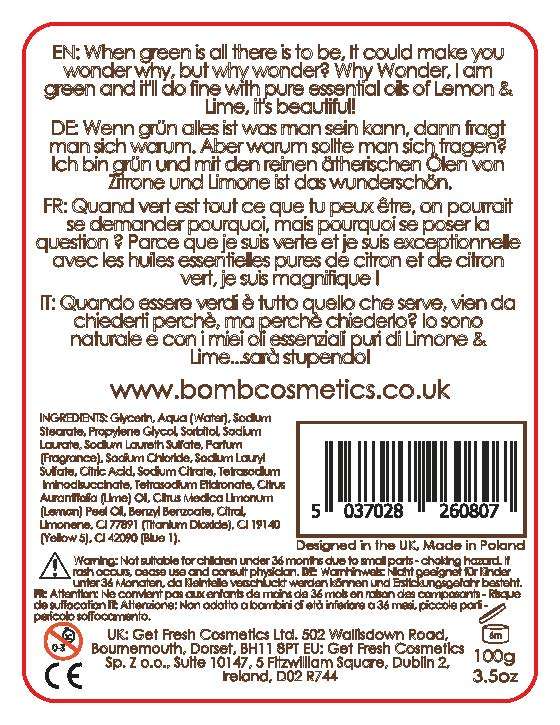 INGREDIENTS: Glycerin, Aqua (Water), Sodium Stearate, Propylene Glycol, Sorbitol, Sodium Laurate, Sodium Laureth Sulfate, Parfum (Fragrance), Sodium Chloride, Sodium Lauryl Sulfate, Citric Acid, Sodium Citrate, Tetrasodium Iminodisuccinate, Tetrasodium Etidronate, Citrus Aurantifolia (Lime) Oil, Citrus Medica Limonum (Lemon) Peel Oil, Benzyl Benzoate, Citral, Limonene, CI 77891 (Titanium Dioxide), CI 19140 (Yellow 5), CI 42090 (Blue 1).