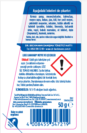 Leke çıkarıcı Dr. Beckmann, kırmızı şarap, kahve, çay, meyve ve sebzeler gibi her türlü meyve ve içecek kirleticilerinin yanı sıra meyve suyu, kakao, küf ve mantar lekelerini giderir.