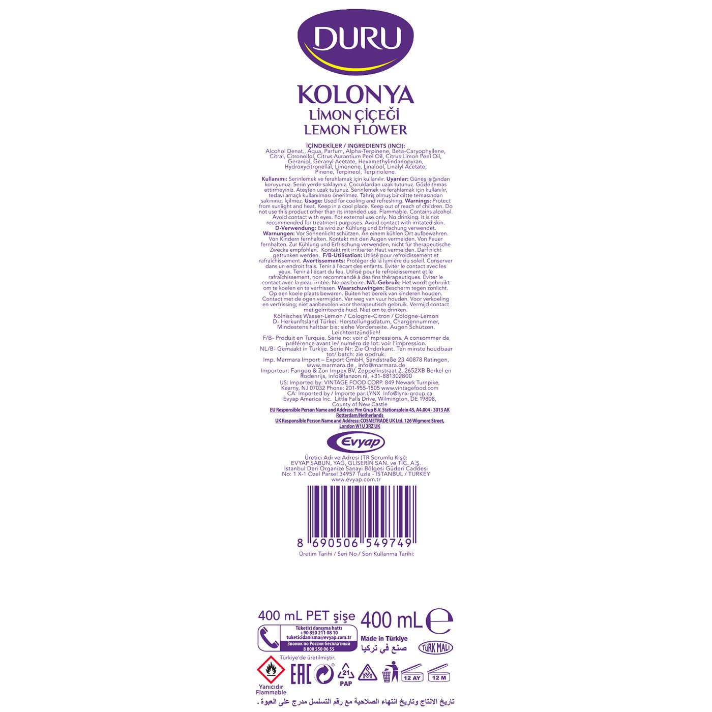 Üretici Adı ve Adresi (TR Sorumlu Kişi): Evyap Sabun Yağ Gliserin San. ve Tic. A.Ş İstanbul Deri Organize Sanayi Bölgesi, Güderi Cad. No: 1X-1 Özel Parsel 34957 Tuzla / İstanbul - www.evyap.com.tr