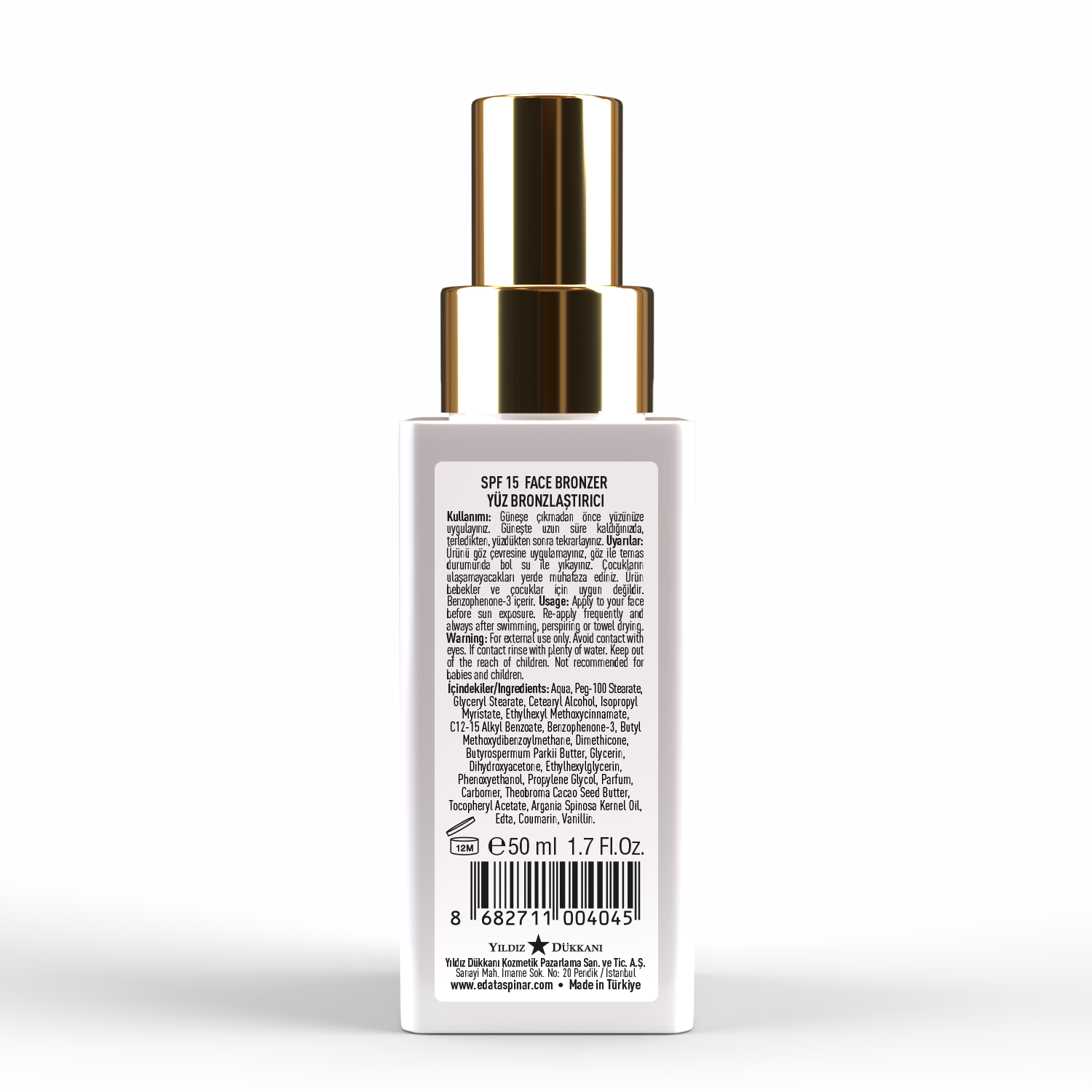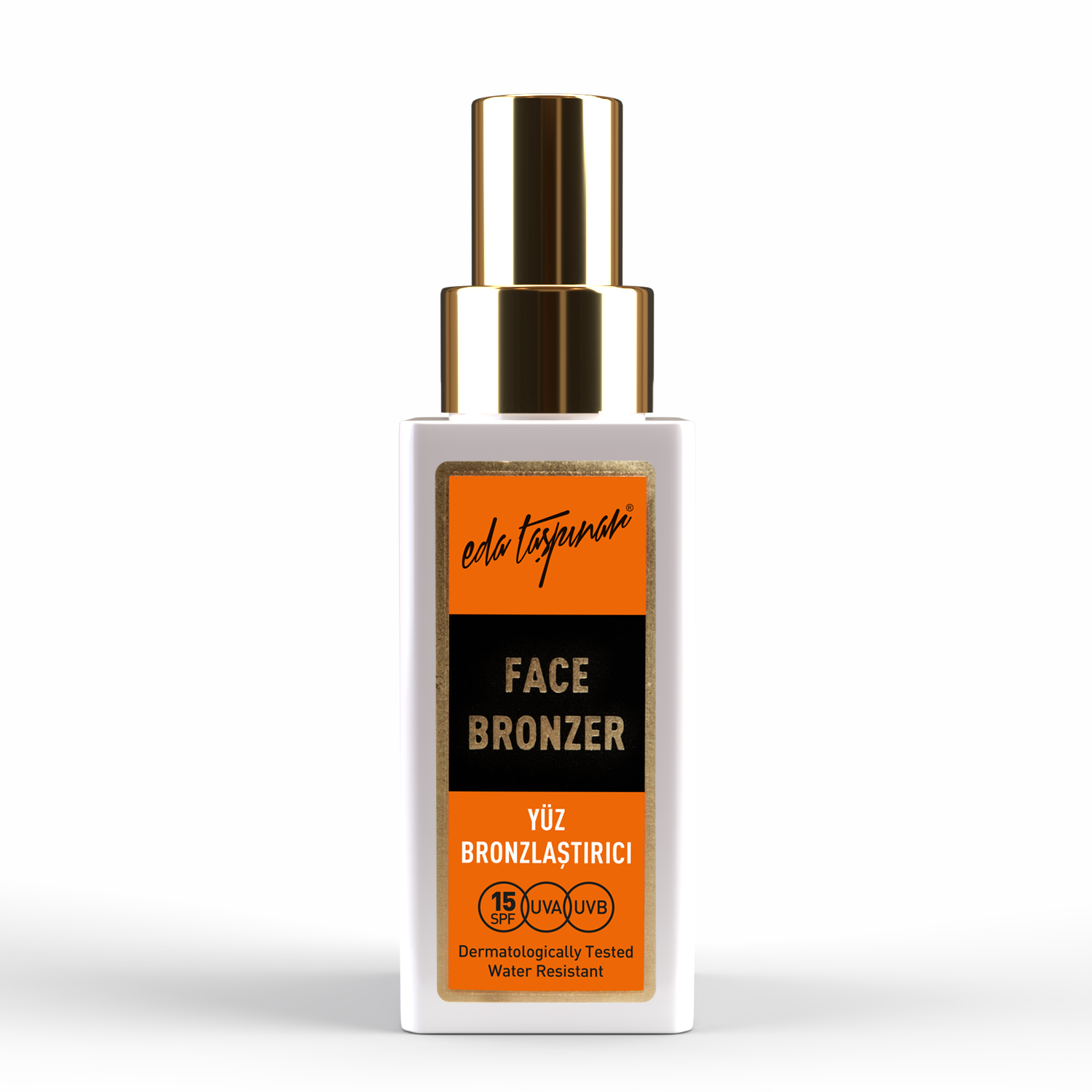 Eda Taşpınar Face Bronzer SPF 15, İçeriğinde yer alan güneş filtreleri sayesinde cildi güneşin etkilerinden korurken, havuç yağı ile güçlendirilmiş bronzlaştırıcı içeriği sayesinde kusursuz bronzluk sunar. Zengin Argan Yağı, Vitamin E ve Shea Yağı içeriği ciltteki hücrelerin yenilenmesini ve cildin daha canlı bir görünüme kavuşmasını sağlar. Cilt bakımının temel öğelerinin uyumlu bir kombinasyonuyla zenginleştirilen bu bronzlaştırıcı, yalnızca bir bronzlaştırıcı değil aynı zamanda cildin için bir kalkandır.