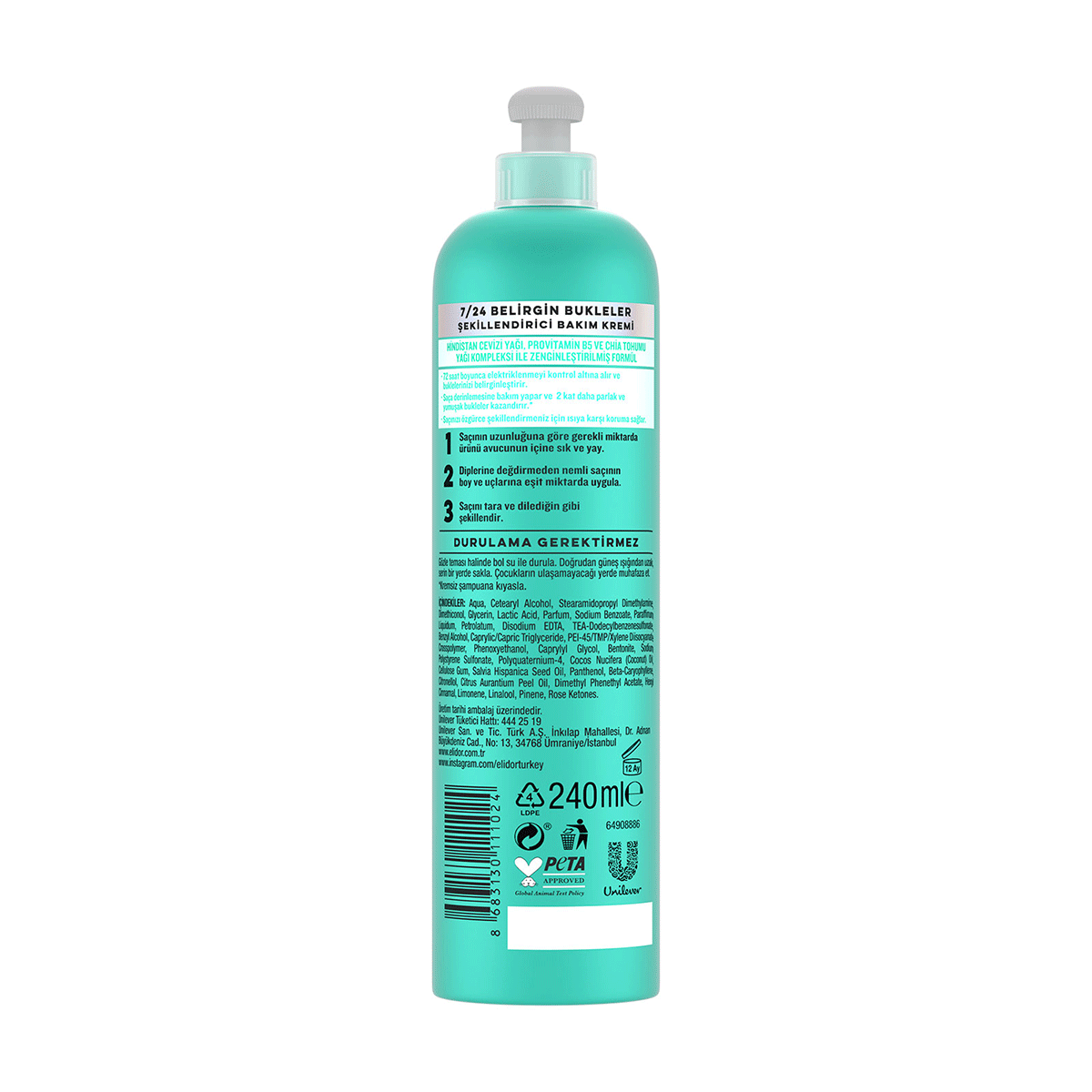 Bu bakım kremi, kıvırcık ve dalgalı saçlar için özel olarak geliştirilmiş bir üründür. Saçın elektriklenmesini kontrol altına alır ve buklelerin belirginliğini artırır. Saçı nemlendirir ve besler, böylece bukleler 2 kat daha yumuşak ve parlak görünür. İçeriğindeki Hindistan Cevizi yağı, Provitamin B5 ve Chia Tohumu yağı sayesinde derinlemesine bakım sağlar. Ayrıca ısıya karşı koruma özelliği sunar, bu yüzden saç şekillendirici aletler kullanıldığında da saçın zarar görmesini önler. Durulama gerektirmeyen formülü sayesinde, saç şekillendirme rutininin pratik ve hızlı bir parçası olur.
