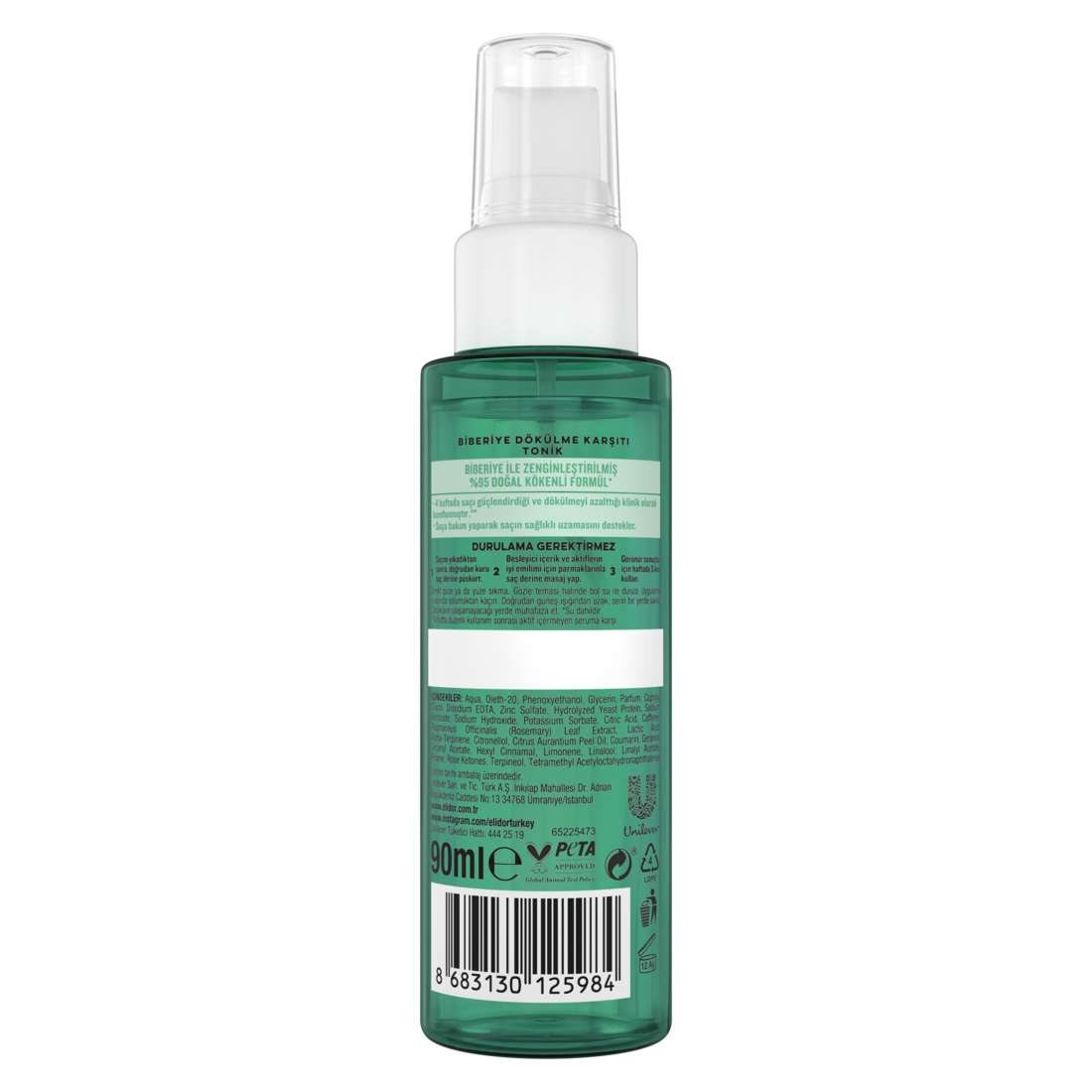 Elidor Biberiye Dökülme Karşıtı Tonik, 90 ml’lik pratik sprey şişe ambalajında sunulur. İnce uçlu püskürtme başlığı sayesinde ürün doğrudan saç derisine kolayca uygulanabilir.