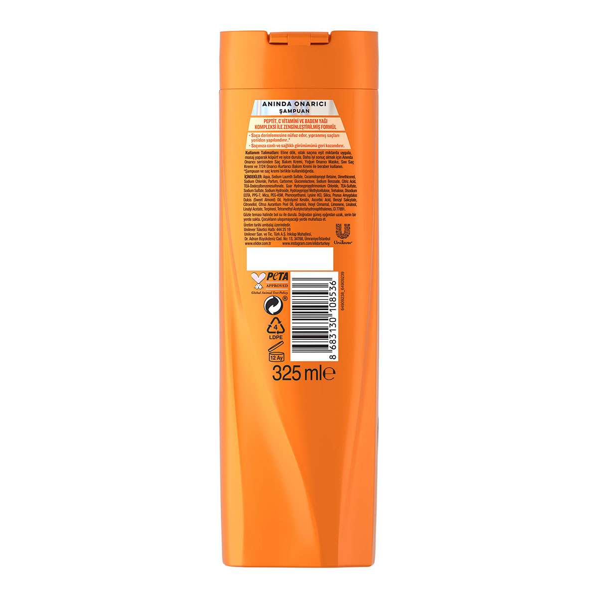 Elidor Anında Onarıcı Şampuan 325 ml, Peptit, C vitamini ve badem yağı kompleksi içeren formülüyle saçları besler, güçlendirmeye yardımcı olur ve sağlıklı bir görünüm kazandırır.