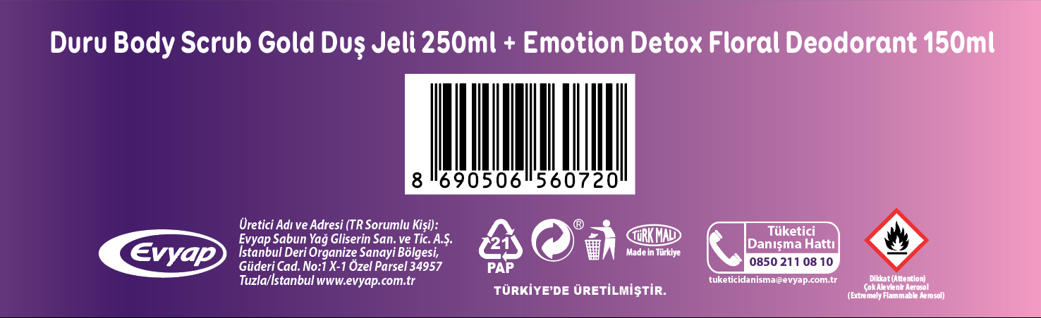 Ilık suyla nazikçe durulayın. Duru Body Scrub duş jeli aynı zamanda cildi temizlediği için tekrar sabun veya başka bir duş jeli kullanmanıza gerek yoktur.