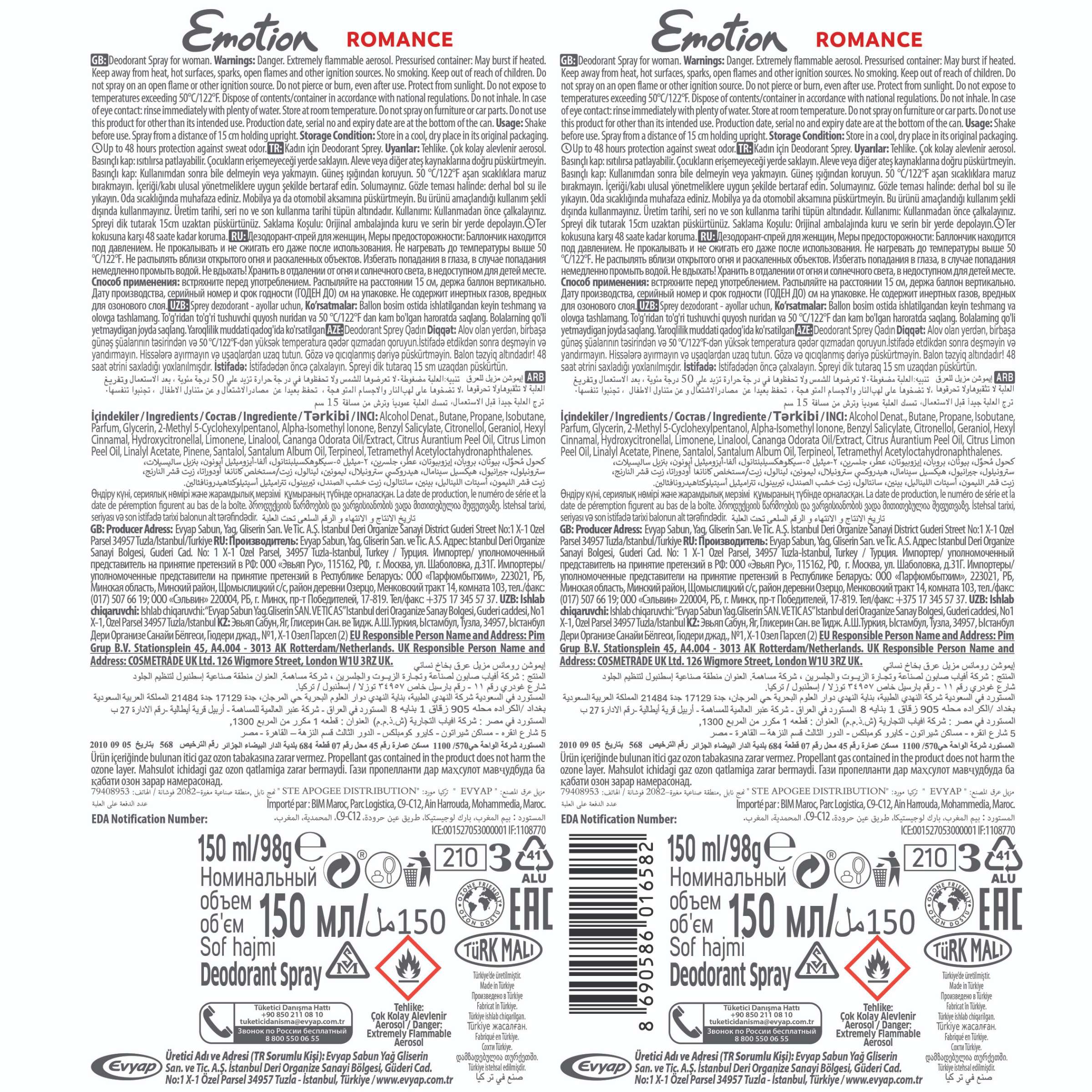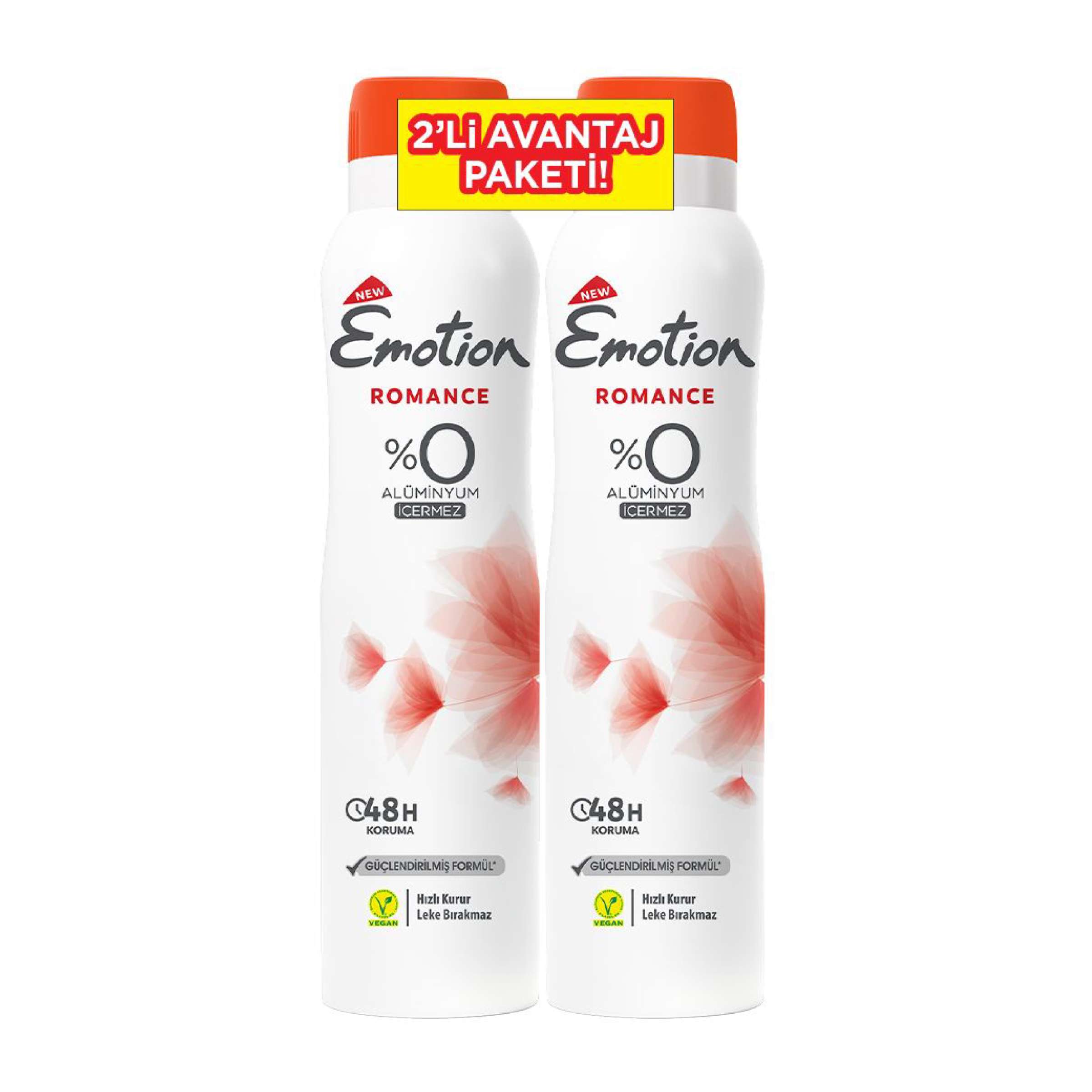 Emotion Romance Deodorant 150 ml, 2’li set olarak özel tasarımlı sprey şişe ambalajıyla kutusuz şekilde gönderilecektir. Ürün üzerinde marka ve içerik bilgileri yer almakta olup, doğrudan kullanıma hazırdır.
