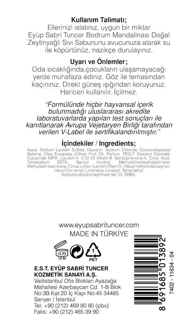 Formülünde hiçbir hayvansal içerik bulunmadığı uluslararası akredite laboratuvarlarda yapılan test sonuçları ile kanıtlanarak Avrupa Vejetaryenler Birliği tarafından verilen V-LABEL ile sertifikalandırılmıştır. İçeriğindeki %100 doğal zeytinyağı ile cildinizin doğal pH dengesini koruyarak kaybettiği nemi tekrar kazandırır. Formülündeki cilde zarar vermeyen, yumuşak, bol köpük yapıcı içeriği ve doğal kaynaklı aktiflerin yardımı ile cildinizde etkin bir temizlik sağlar. Geleneksel zeytinyağlı kalıp sabunların başarılı notlarını içeren koku profili floral, vanilya, sandal ve misk notlarının eşsiz uyumuyla cildinize gün boyu ferahlık hissi verir. Tüm cilt tiplerinde günlük kullanım için uygundur.