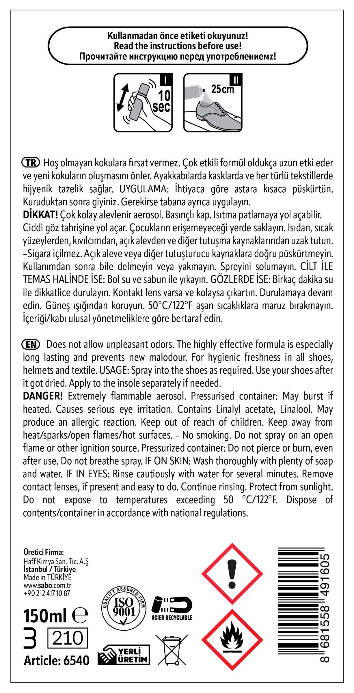 Çok kolay alevlenir aerosol. Basınçlı kap. Isıtma patlamaya yol açabilir.Ciddi göz tahrişine yol açar. Çocukların erişemeyeceği yerde saklayın.Isıdan, sıcak yüzeylerden, kıvılcımdan, açık alevden ve diğer tutuşma kaynaklarından uzak tutun. –Sigara içilmez. Açık aleve veya diğer tutuşturucu kaynaklara doğru püskürtmeyin. Kullanımdan sonra bile delmeyin veya yakmayın.Spreyini solumayın. CİLT İLE TEMAS HALİNDE İSE: Bol su ve sabun ile yıkayın. GÖZLERDE İSE: Birkaç dakika su ile dikkatlice durulayın. Kontakt lens varsa ve kolaysa çıkartın.Durulamaya devam edin.Güneş ışığından koruyun. 50°C/122°F aşan sıcaklıklara maruz bırakmayın. İçeriği/kabı ulusal yönetmeliklere göre bertaraf edin.