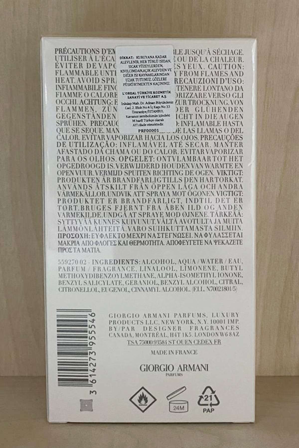 ALCOHOL, AQUA/WATER/EAU, PARFUM/FRAGRANCE, LINALOOL, LIMONENE, BUTYL METHOXYDIBENZOYLMETHANE, ALPHA-ISOMETHYL IONONE, BENZYL SALICYLATE, GERANIOL, BENZYL ALCOHOL, CITRAL, CITRONELLOL, EUGENOL, CINNAMYL ALCOHOL. (ELL, N70021801/5)