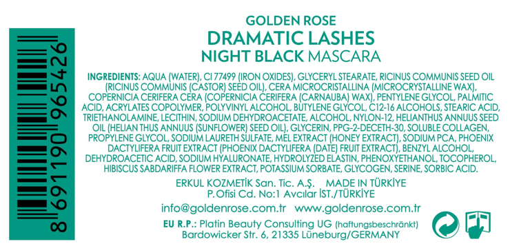 Golden Rose Dramatic Lashes Night Black Mascara yoğun siyah renkli mükemmel formülü kolay uygulama sağlayan yeni plastik fırçası ile kirpiklerinizi tek tek kaplayarak daha dolgun, hacimli, daha uzun ve belirgin kirpiklere sahip olmanızı sağlar.
