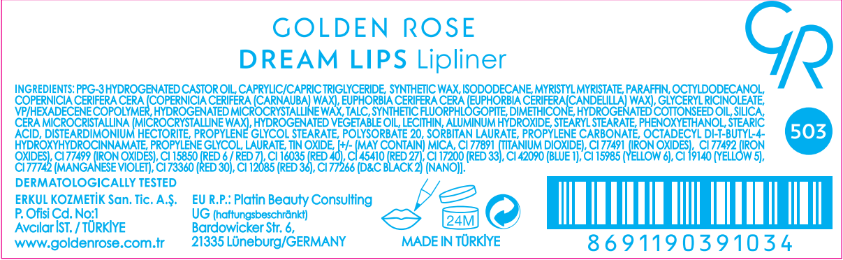 Golden Rose Dream Dudak Kalemi No: 503 özel formülü ile dudak hattını belirginleştirmek, dudakların daha dolgun görünmesini sağlamak veya dudak renklendirmek içindir.