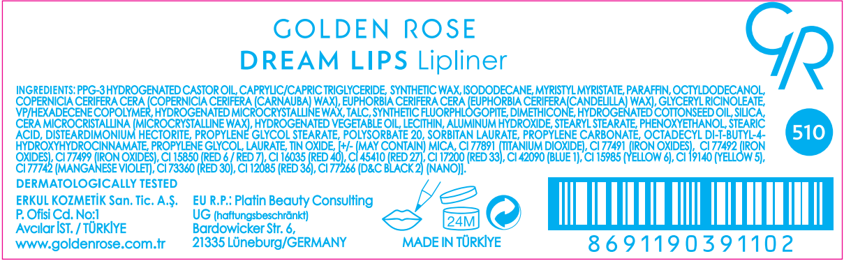 Golden Rose Dream Dudak Kalemi No: 510 özel formülü ile dudak hattını belirginleştirmek, dudakların daha dolgun görünmesini sağlamak veya dudak renklendirmek içindir.
