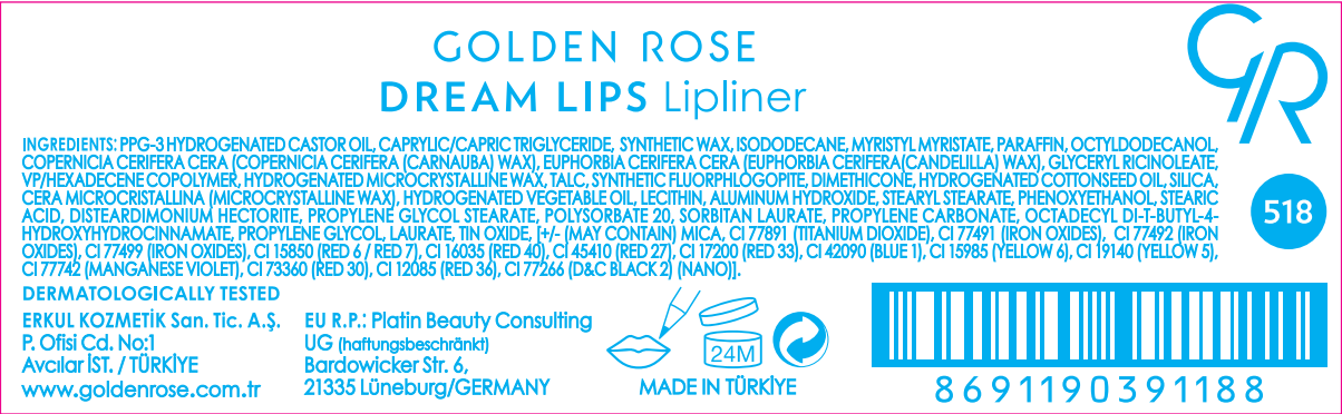 Golden Rose Dream Dudak Kalemi No: 518 özel formülü ile dudak hattını belirginleştirmek, dudakların daha dolgun görünmesini sağlamak veya dudak renklendirmek içindir.
