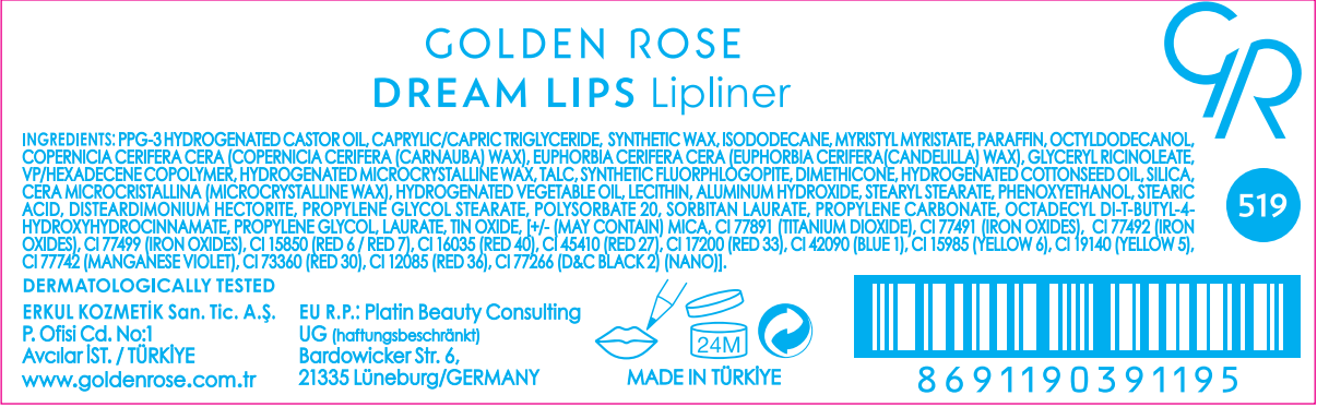 Golden Rose Dream Dudak Kalemi No: 519 özel formülü ile dudak hattını belirginleştirmek, dudakların daha dolgun görünmesini sağlamak veya dudak renklendirmek içindir.
