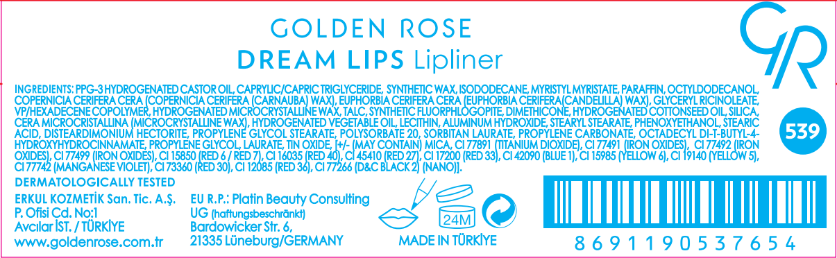 Golden Rose Dream Dudak Kalemi No: 539 özel formülü ile dudak hattını belirginleştirmek, dudakların daha dolgun görünmesini sağlamak veya dudak renklendirmek içindir.