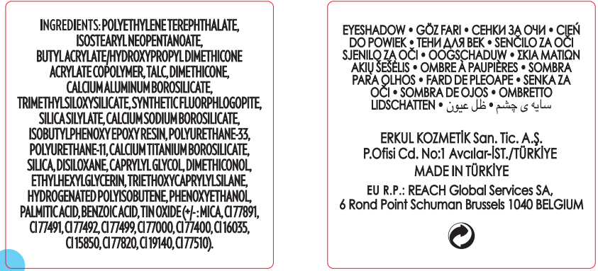 INGREDIENTS : POLYETHYLENE TEREPHTHALATE, ISOSTEARYL NEOPENTANOATE, BUTYL ACRYLATE/HYDROXYPROPYL DIMETHICONE ACRYLATE COPOLYMER, TALC, DIMETHICONE, CALCIUM ALUMINUM BOROSILICATE, TRIMETHYLSILOXYSILICATE, SYNTHETIC FLUORPHLOGOPITE, SILICA SILYLATE, CALCIUM SODIUM BOROSILICATE, ISOBUTYLPHENOXY EPOXY RESIN, POLYURETHANE-33, POLYURETHANE-11, CALCIUM TITANIUM BOROSILICATE, SILICA, DISILOXANE, CAPRYLYL GLYCOL, DIMETHICONOL, ETHYLHEXYLGLYCERIN, TRIETHOXYCAPRYLYLSILANE, HYDROGENATED POLYISOBUTENE, PHENOXYETHANOL, PALMITIC ACID, BENZOIC ACID, TIN OXIDE, [+/- (MAY CONTAIN) MICA, CI 77891 (TITANIUM DIOXIDE), CI 77491 (IRON OXIDES), CI 77492 (IRON OXIDES), CI 77499 (IRON OXIDES), CI 77000 (ALUMINUM POWDER),CI 77400 (BRONZE POWDER / COPPER POWDER), CI 16035 (RED 40), CI 19140 (YELLOW 5), CI 77510 (FERRIC FERROCYANIDE)].