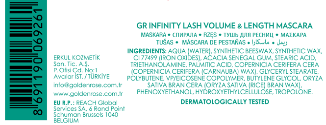 Golden Rose Infinity Lash Volume&Length Mascara geniş ve büyük fiber fırçalı hacim, uzunluk ve kıvrım veren bir maskaradır.