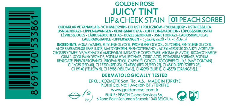 Golden Rose Lip & Cheek Tint No: 01 Peach Sorbe hafif, su bazlı, çabuk kuruyan yapısı ile cildinizle bütünleşen, dudaklara ve yanaklara gün boyu doğal bir renk veren bir dudak ve yanak renklendiricisidir.