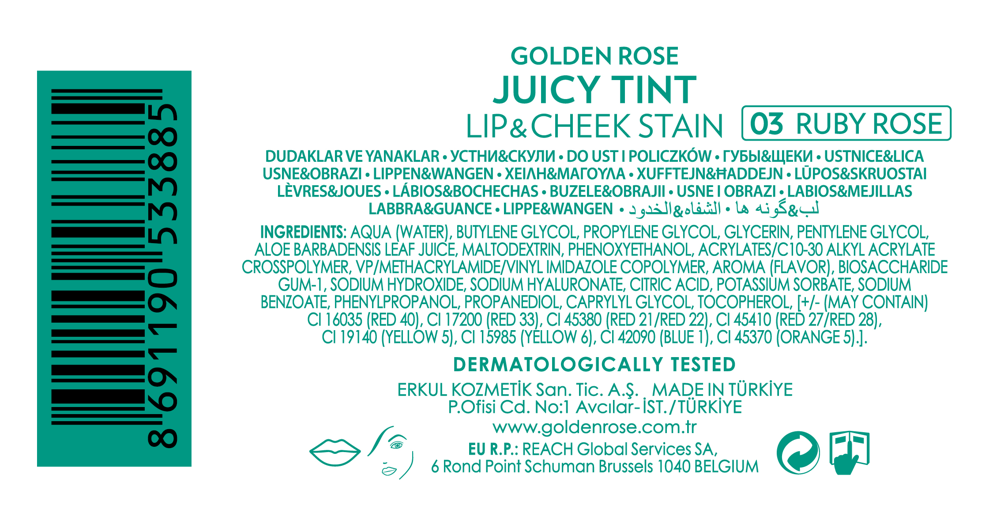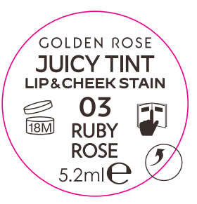 Golden Rose Lip & Cheek Tint No: 03 Ruby Rose hafif, su bazlı, çabuk kuruyan yapısı ile cildinizle bütünleşen, dudaklara ve yanaklara gün boyu doğal bir renk veren bir dudak ve yanak renklendiricisidir.