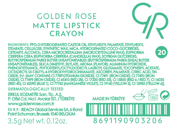 Golden Rose Mat Ruj Crayon No: 20 kadifemsi, mat, yumuşak formülü ve yoğun kapatıcılık özelliği ile kolayca sürülen kalem bir rujdur.