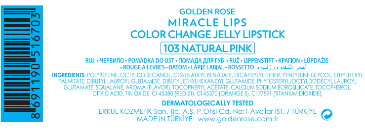 Golden Rose Miracle Lips Color Change Ruj No: 103 dudakların doğal rengini arttırarak mükemmel pembe bir görünüm sağlar ve uzun süre dudakta kalır.