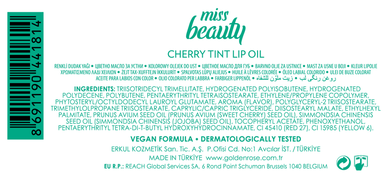 Golden Rose Miss Beauty Dudak Parlatıcısı Cherry Tint vegan formülü, içeriğindeki Meyve Yağları, Jojoba Yağı ve Vitamin E ile dudaklarınızı besleyen, nemlendiren ve parlak bir görünüm sağlayan dudak yağıdır.