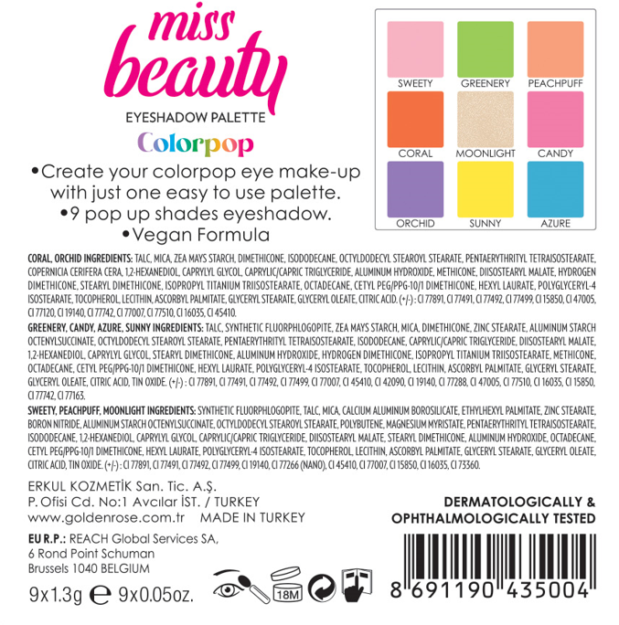 Golden Rose Miss Beauty Far Paleti Colorpop ; Birbiriyle uyumlu renk tonları ile mükemmel naturel göz makyajı ve etkileyici bakışlar yaratmanızı sağlar.