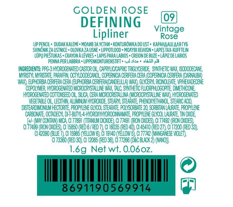 Golden Rose Mood Defining Dudak Kalemi No:09 yoğun pigment içeren uzun süre kalıcı formüllü ve yumuşak yapılı bir kalemdir.