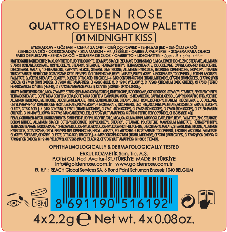 Golden Rose Quattro Far Paleti No: 01 Midnight Kiss satin, mat, ışıltılı ve sedefli bitişlere sahip 4 ayrı renkten oluşan, yoğun renk veren bir far paletidir.