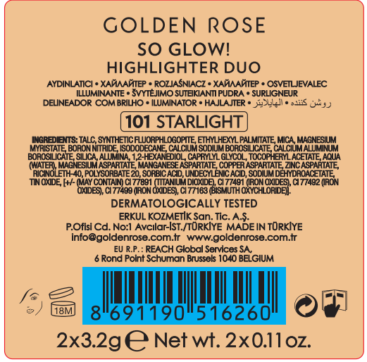 Golden Rose So Glow Aydınlatıcı Far Paleti No: 101 gün boyu kusursuz ve ışıltılı bir görünüme sahip olmanızı sağlayan, yüzünüzde öne çıkarmak istediğiniz bölgelere parlaklık ve canlılık kazandıran bir aydınlatıcı ikili far paletidir.