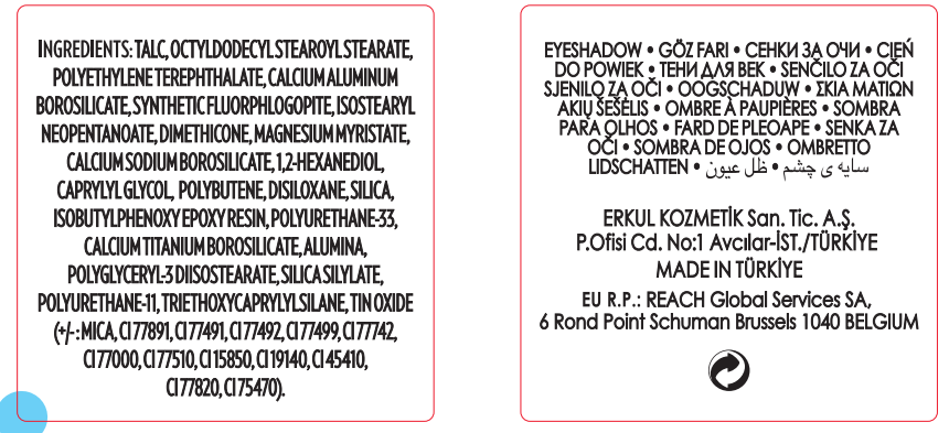 INGREDIENTS : TALC, OCTYLDODECYL STEAROYL STEARATE, POLYETHYLENE TEREPHTHALATE, CALCIUM ALUMINUM BOROSILICATE, SYNTHETIC FLUORPHLOGOPITE, ISOSTEARYL NEOPENTANOATE, DIMETHICONE, MAGNESIUM MYRISTATE, CALCIUM SODIUM BOROSILICATE, 1,2-HEXANEDIOL, CAPRYLYL GLYCOL, POLYBUTENE, DISILOXANE, SILICA, ISOBUTYLPHENOXY EPOXY RESIN, POLYURETHANE-33, CALCIUM TITANIUM BOROSILICATE, ALUMINA, POLYGLYCERYL-3 DIISOSTEARATE, SILICA SILYLATE, POLYURETHANE-11, TRIETHOXYCAPRYLYLSILANE, TIN OXIDE, [+/- (MAY CONTAIN) MICA, CI 77891 (TITANIUM DIOXIDE), CI 77491 (IRON OXIDES), CI 77492 (IRON OXIDES), CI 77499 (IRON OXIDES), CI 77742 (MANGANESE VIOLET), CI 77000 (ALUMINUM POWDER), CI 77510 (FERRIC FERROCYANIDE), CI 19140 (YELLOW 5), CI 75470 (CARMINE)].