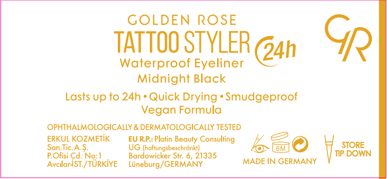 Golden Rose Tattoo Styler Waterproof Eyeliner mat ve ultra siyah yapısı ile gözlerinizde dramatik bakışlar yaratan,vegan, suya dayanıklı ve çabuk kuruyan tekstürü ile akma ve bulaşma yapmadan gün boyu kalıcılık sağlayan, ultra ince ve esnek ucu sayesinde kolayca uygulanan bir eyelinerdır.