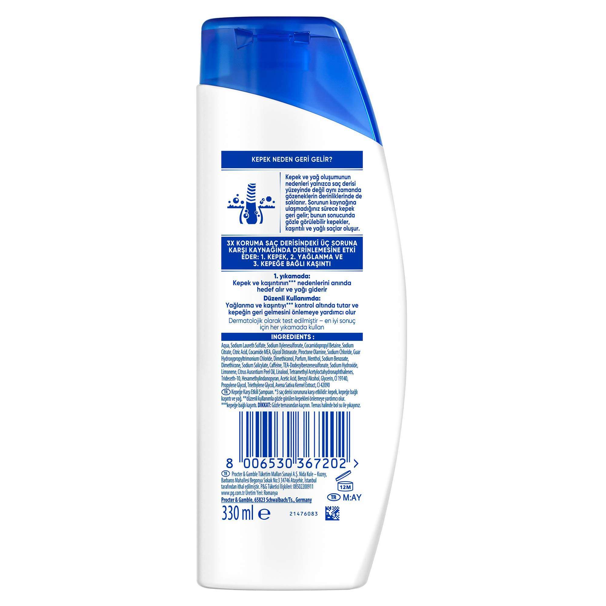 Aqua, Sodium Laureth Sulfate, Sodium Xylenesulfonate, Cocamidopropyl Betaine, Sodium Citrate, Citric Acid, Cocamide MEA, Glycol Distearate, Piroctone Olamine, Sodium Chloride, Guar Hydroxypropyltrimonium Chloride, Dimethiconol, Parfum, Menthol, Sodium Benzoate, Dimethicone, Sodium Salicylate, Caffeine, TEA-Dodecylbenzenesulfonate, Sodium Hydroxide, Limonene, Citrus Aurantium Peel Oil, Linalool, Tetramethyl Acetyloctahydronaphthalenes, Trideceth-10, Hexamethylindanopyran, Acetic Acid, Benzyl Alcohol, Glycerin, CI 19140, Propylene Glycol, Triethylene Glycol, Avena Sativa Kernel Extract, CI 42090