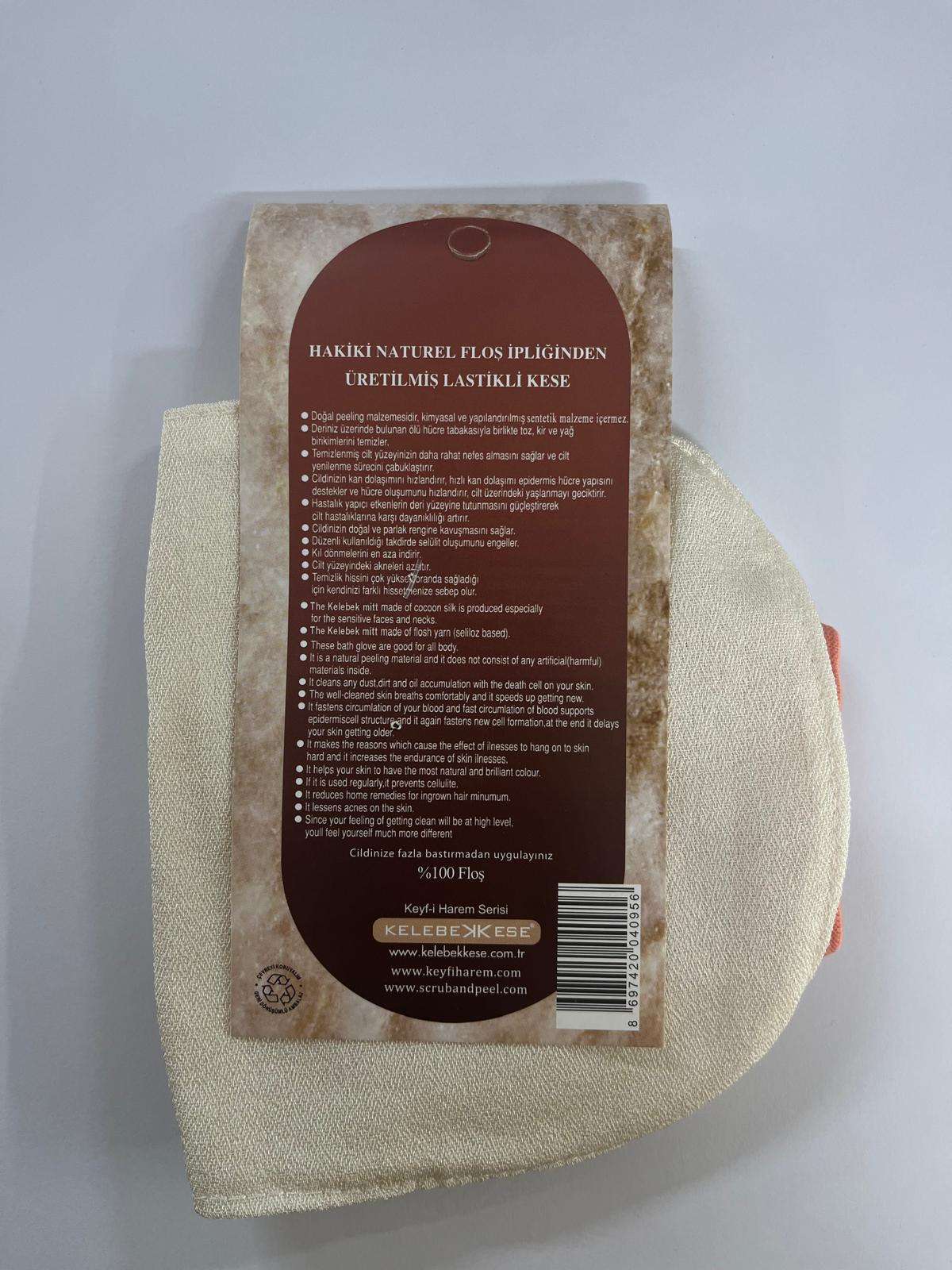 Kese %100 floş ipliğinden üretilmiştir.Doğal peeling malzemesidir.kimyasal ve yapılandırılmış sentetik malzeme içermez.Derinizin üzerinde bulunan ölü hücre tabakasıyla birlikte toz,kir ve yağ birikimlerini temizler.cildinizi yeniler,kan dolaşımını hızlandırır.cilt üzerindeki yaşlanmayı geciktirir.kıl dönmelerini en aza indirir.cilt üzerindeki akneleri azaltır.