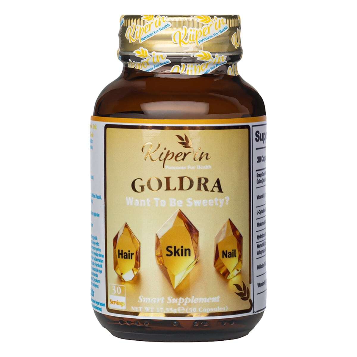 Kiperin Goldra Cilt Saç&Tırnak Kapsül 30'lu, ergonomik ve kolay taşıma sağlayan 30 kapsüllük bir şişede sunulur. Kapsül formu günlük alımı konforlu hale getirir ve ambalajı, ürünün premium duruşunu yansıtır.