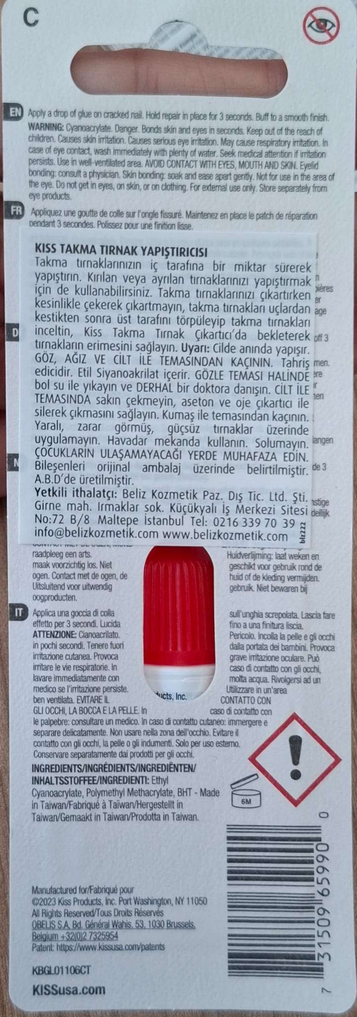 Cilde anında yapışır. GÖZ, AĞIZ VE CİLT İLE TEMASINDAN KAÇININ. Tahriş edicidir. Etil Siyanoakrilat içerir. GÖZLE TEMASI HALİNDE bol su ile yıkayın ve DERHAL bir doktora danışın. CİLT İLE TEMASINDA sakın çekmeyin, aseton ve oje çıkartıcı ile silerek çıkmasını sağlayın. Kumaş ile temasından kaçının. Yaralı, zarar görmüş, güçsüz tırnaklar üzerinde uygulamayın. Havadar mekanda kullanın. Solumayın. ÇOCUKLARIN ULAŞAMAYACAĞI YERDE MUHAFAZA EDİN. Bileşenleri orijinal ambalaj üzerinde belirtilmiştir.